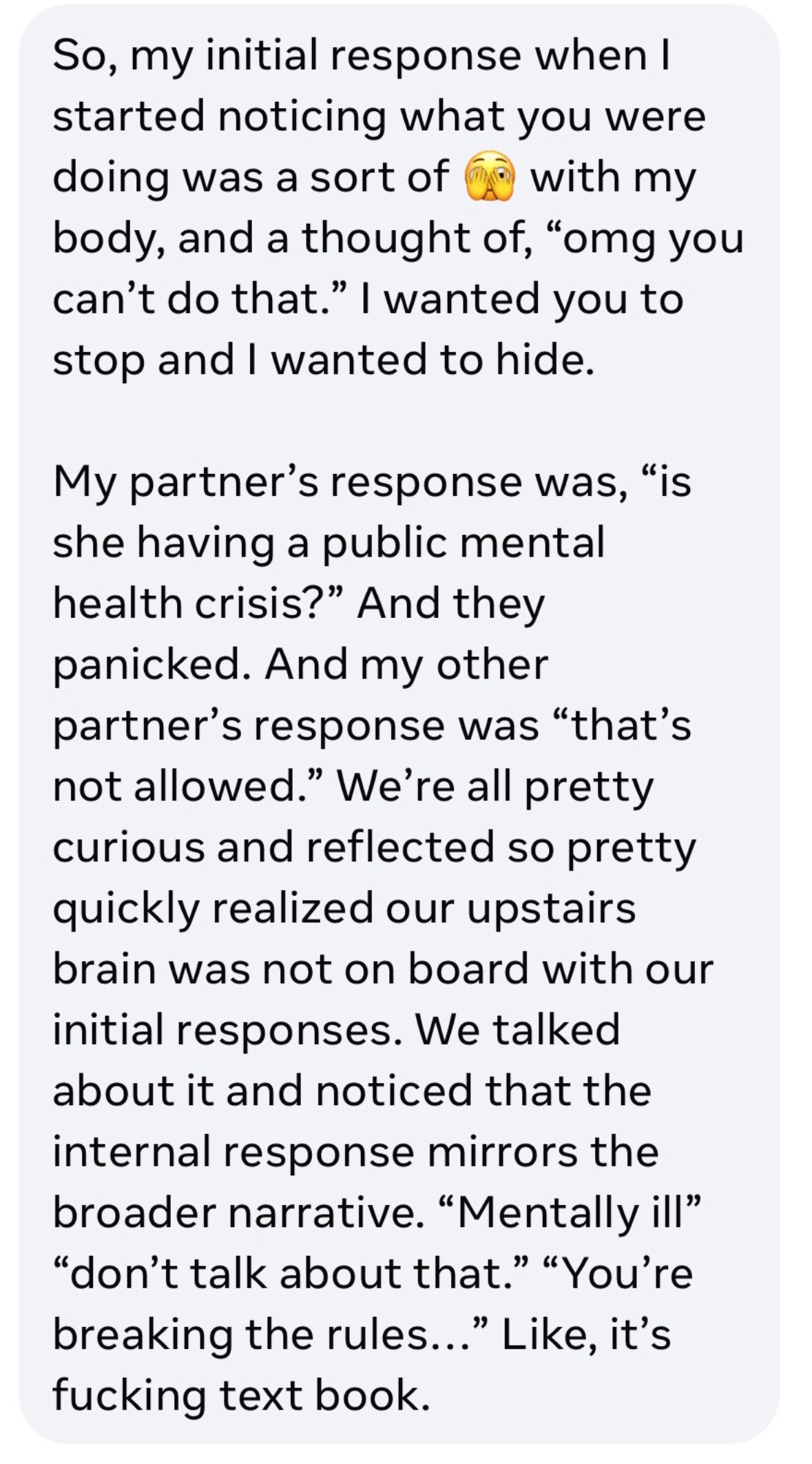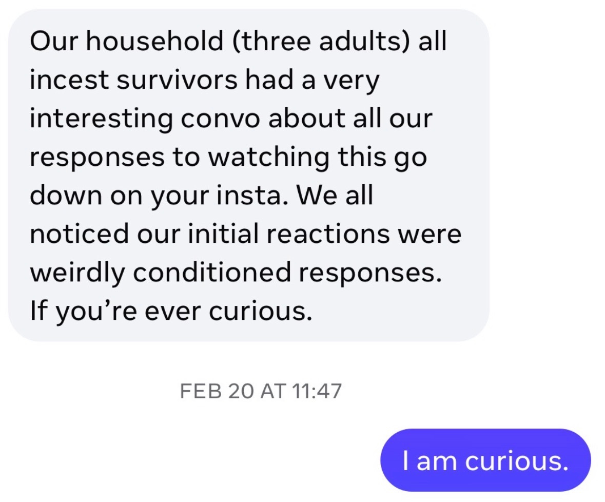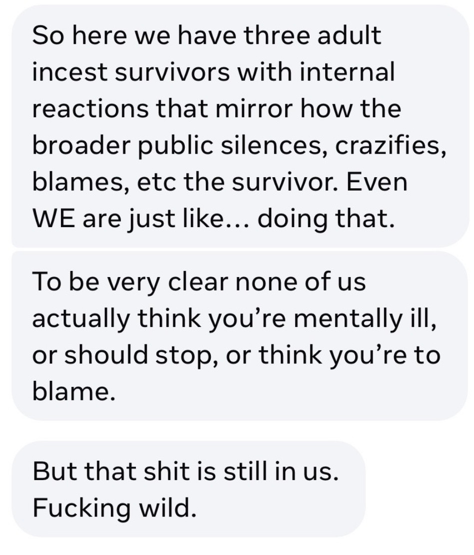 This message was difficult to receive but I still appreciate the honesty. Anyone who has spoken about incest knows what it feels like to receive these responses and to feel these responses hanging in the air even when no one says them out loud. It takes courage to admit when we notice automatic patterns within ourselves that uphold systems we want to see dismantled.