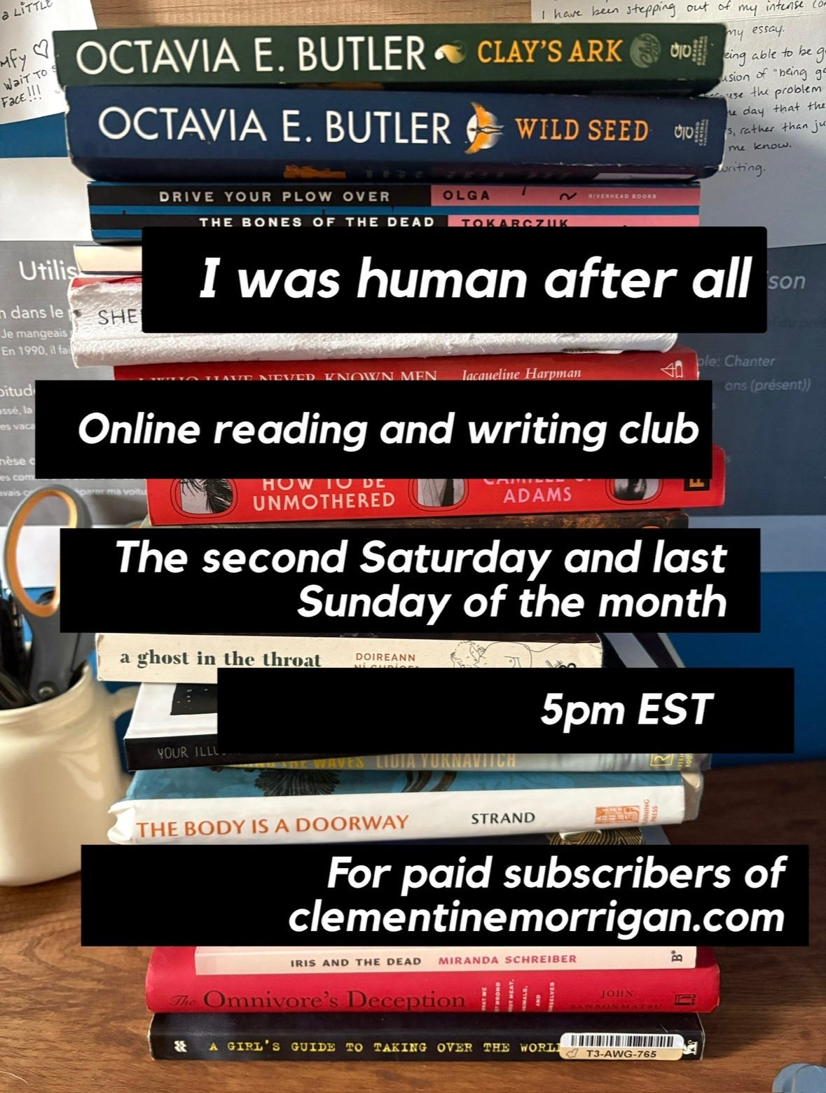 This substack hosts two monthly zoom meetings for paid subscribers! On the second Saturday of the month at 5pm EST we will have a writing group with writing prompts, time for writing, and the opportunity to share your writing. On the last Sunday of the month at 5pm EST we will have a book club where we will discuss a mix of memoirs and weird fiction (and maybe sometimes other stuff). There is also a telegram group where you can chat with other participants, discuss books, and share writing. All the groups are drop in / optional. You can come to just the book club, just the writing club, or a mix of both. Meeting aren’t recorded because I want people to feel free to share openly.