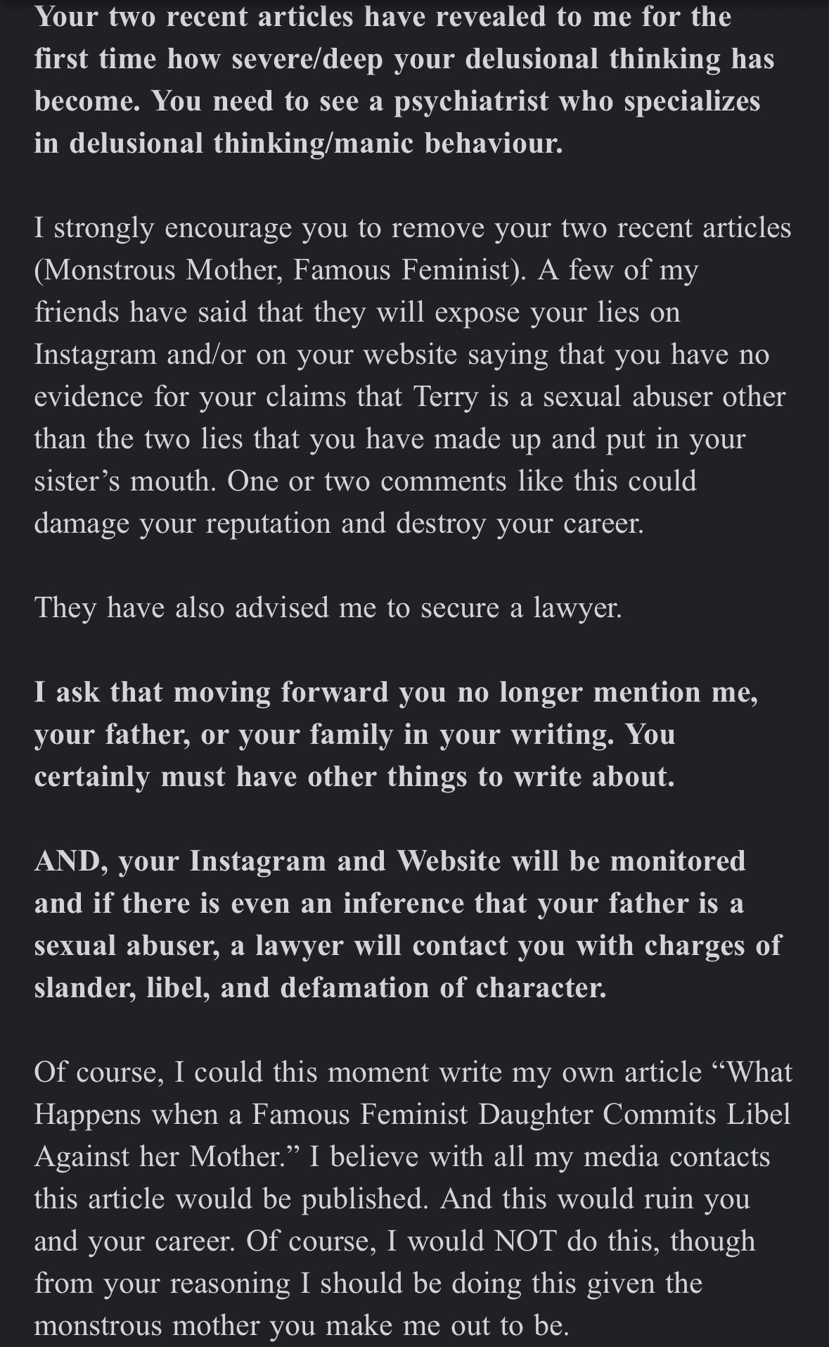 At the time, everyone in my life panicked about her threat and encouraged me to “be careful.” I decided to ignore their advice and I shared the above excerpt from her emails on my instagram while blocking out my father’s name and not naming her. I was advised that I should take it down but it felt extremely wrong to take it down so I didn’t. After seeing that I had done that, she backed off with her threats and left me alone.