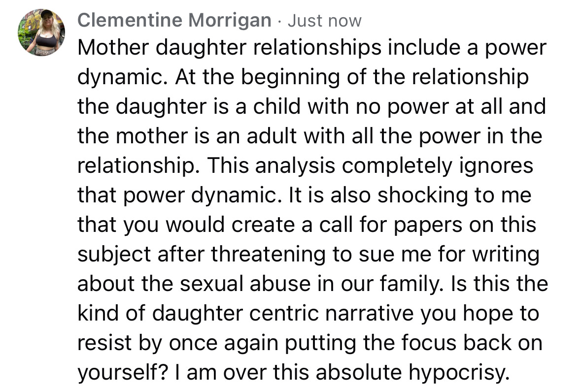 I don’t even have the words for how this makes me feel. Angry does not cover it. Unloved doesn’t either. My mother created this call for papers about “resisting daughter-centricity, reclaiming matrifocality” one year after threatening to sue me for writing about the sexual abuse in our family. This is the “daughter-centricity” that she is resisting — through threats of legal action. When I read this, something broke inside me. The long held hope that if I just found the right way to say it, that if I just approached her correctly, that if I just understood her enough, she would finally be able to hear me disappeared. I saw that her self-justification runs so extremely deep. I saw that she has no empathy or compassion for me at all. Despite being the woman who brought me into this world, her treatment of me cannot accurately be described as “mothering.” It certainly can’t be described as feminist.