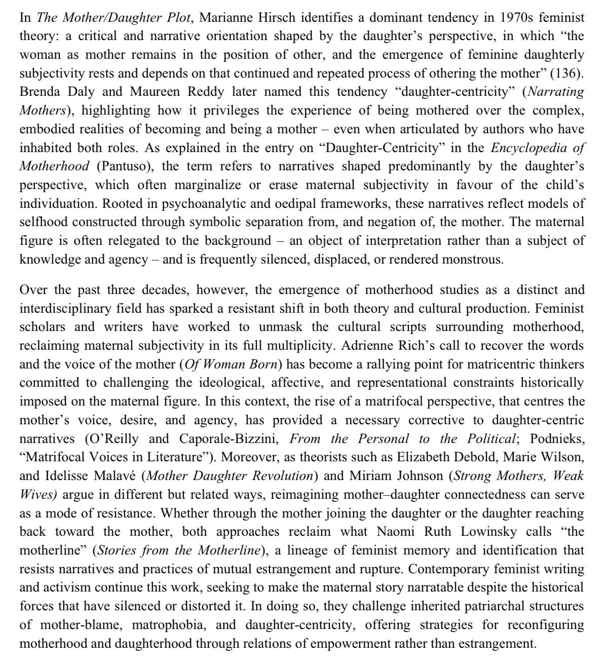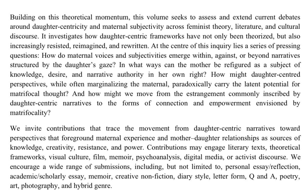 Recently I came across a call for papers for a new book my mother is co-editing on the subject of “resisting daughter-centricity, reclaiming matrifocality.” Here it is.