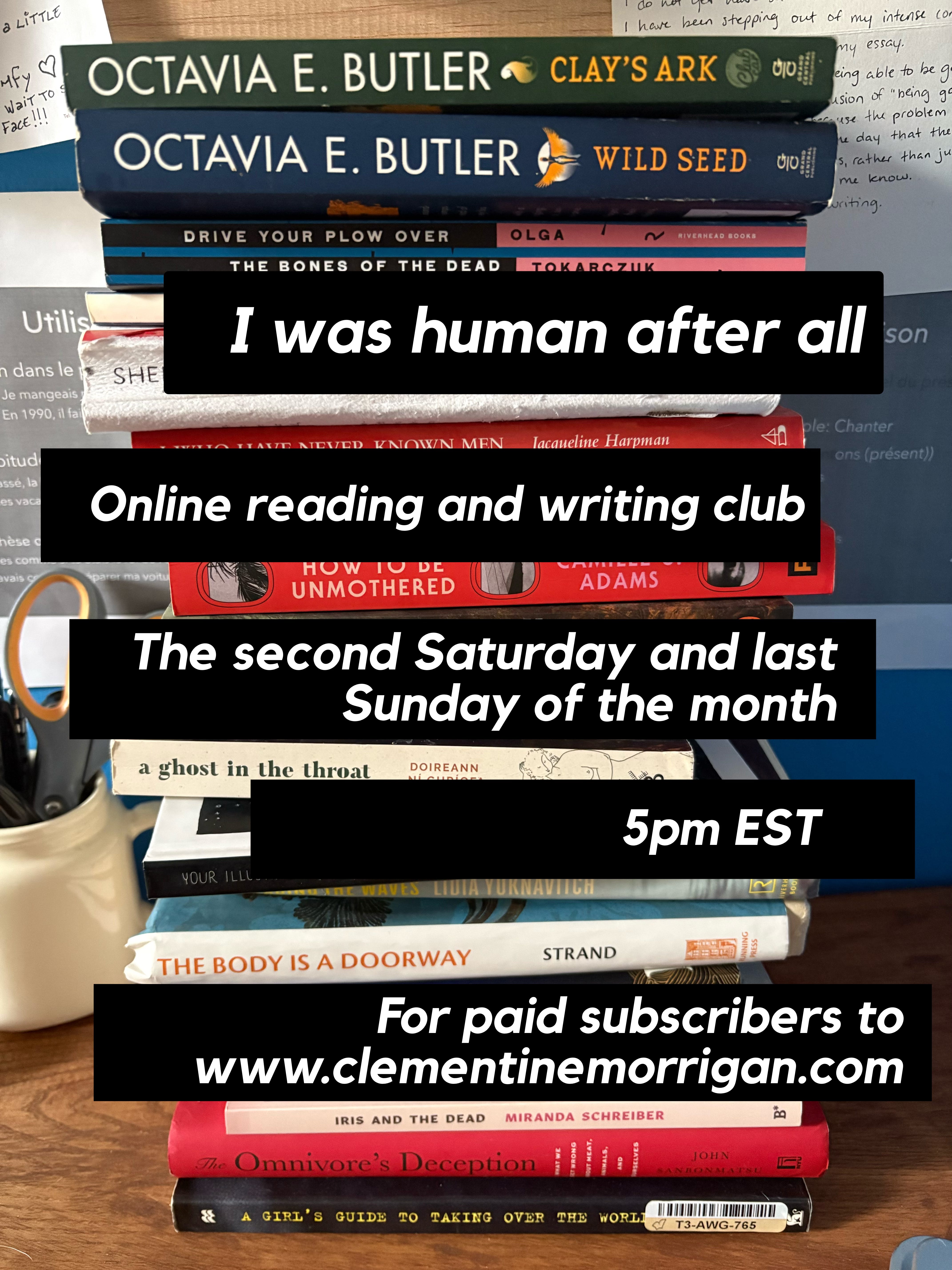 And… big announcement! The book club is branching out to include a monthly writing club! All sessions are drop in / optional. You can come to just the book club, just the writing club, or a mix of both. There is a telegram chat to keep in touch with participants, discuss books, and share writing. Come be nerdy with us.
